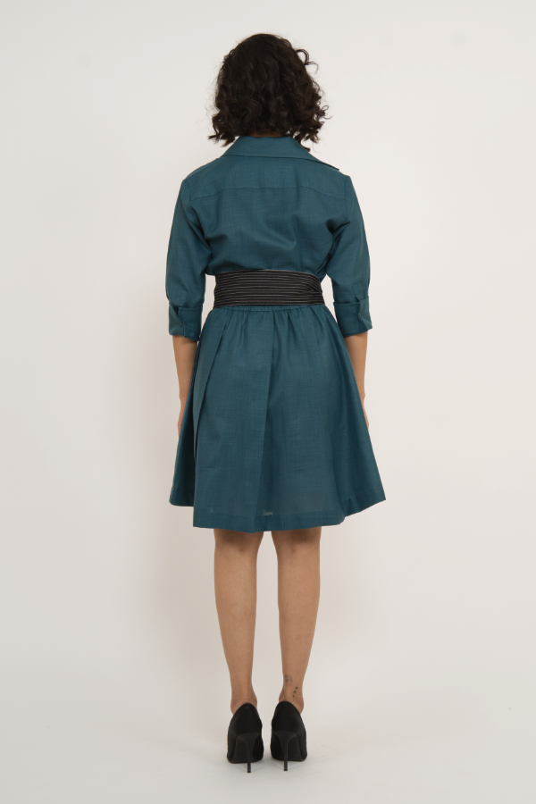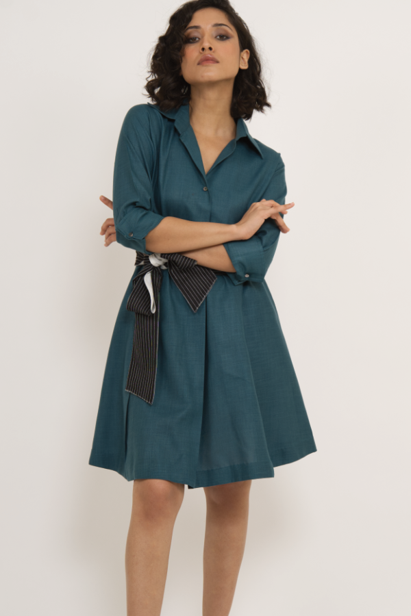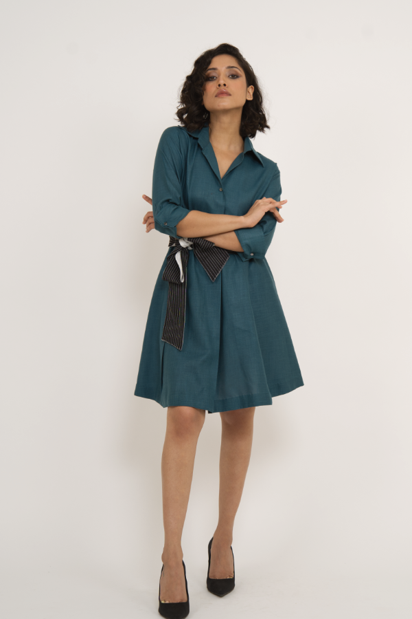 Teal Shirt Dress with Contrast Waist Tie